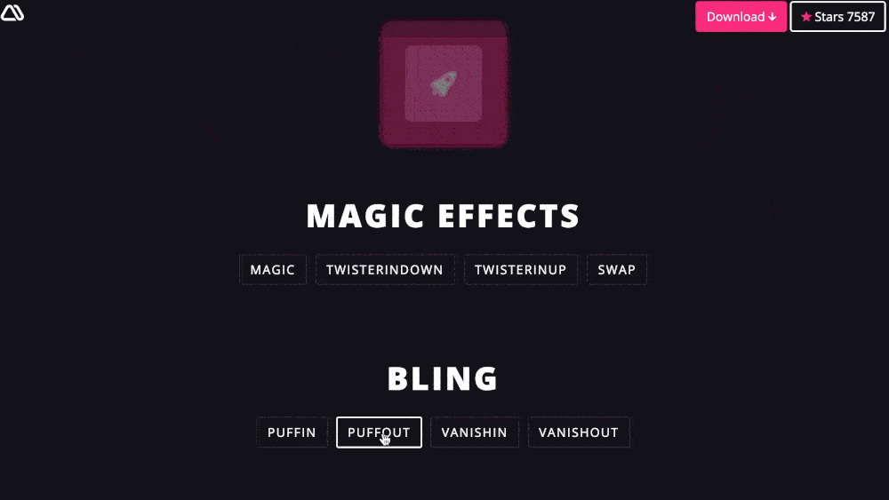非常適合那些通過(guò)一些甜美的動(dòng)畫(huà)效果來(lái)為他們的網(wǎng)站增添趣味的人。在網(wǎng)站上找到您需要的所有內(nèi)容并下載 CSS 文件。然后您就可以開(kāi)始使用簡(jiǎn)單的類(lèi)選擇器向您的網(wǎng)站添加動(dòng)畫(huà)效果。