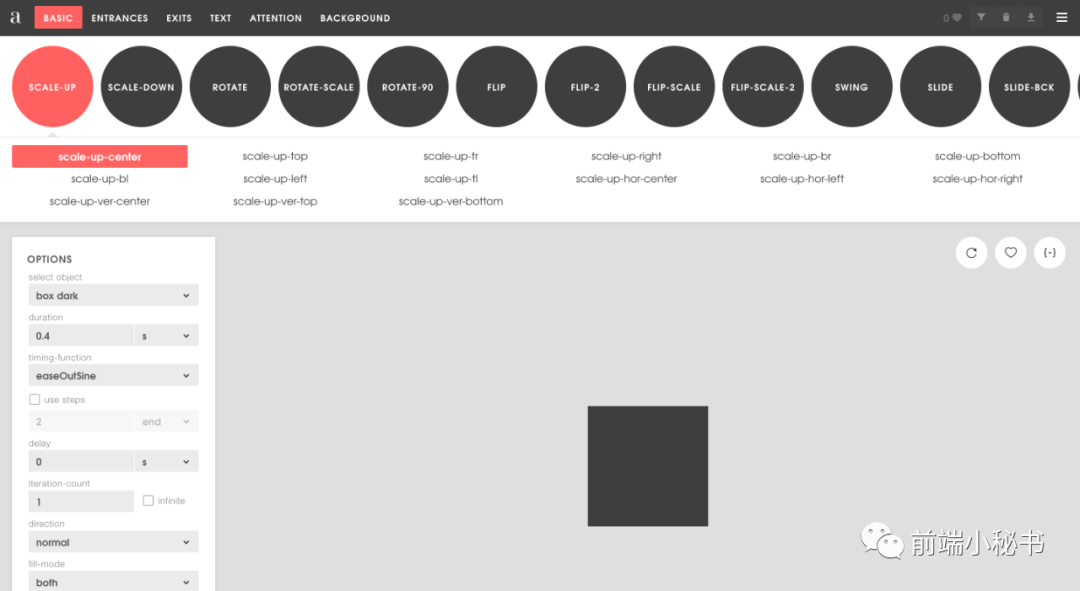 Animista 是一個(gè) CSS 動(dòng)畫(huà)庫(kù),您可以在其中使用一組現(xiàn)成的 CSS 動(dòng)畫(huà)并僅下載您將使用的動(dòng)畫(huà)。也是本人最喜歡的一個(gè)動(dòng)畫(huà)庫(kù),支持在線編輯參數(shù)、實(shí)時(shí)演示。支持一鍵拷貝代碼。
